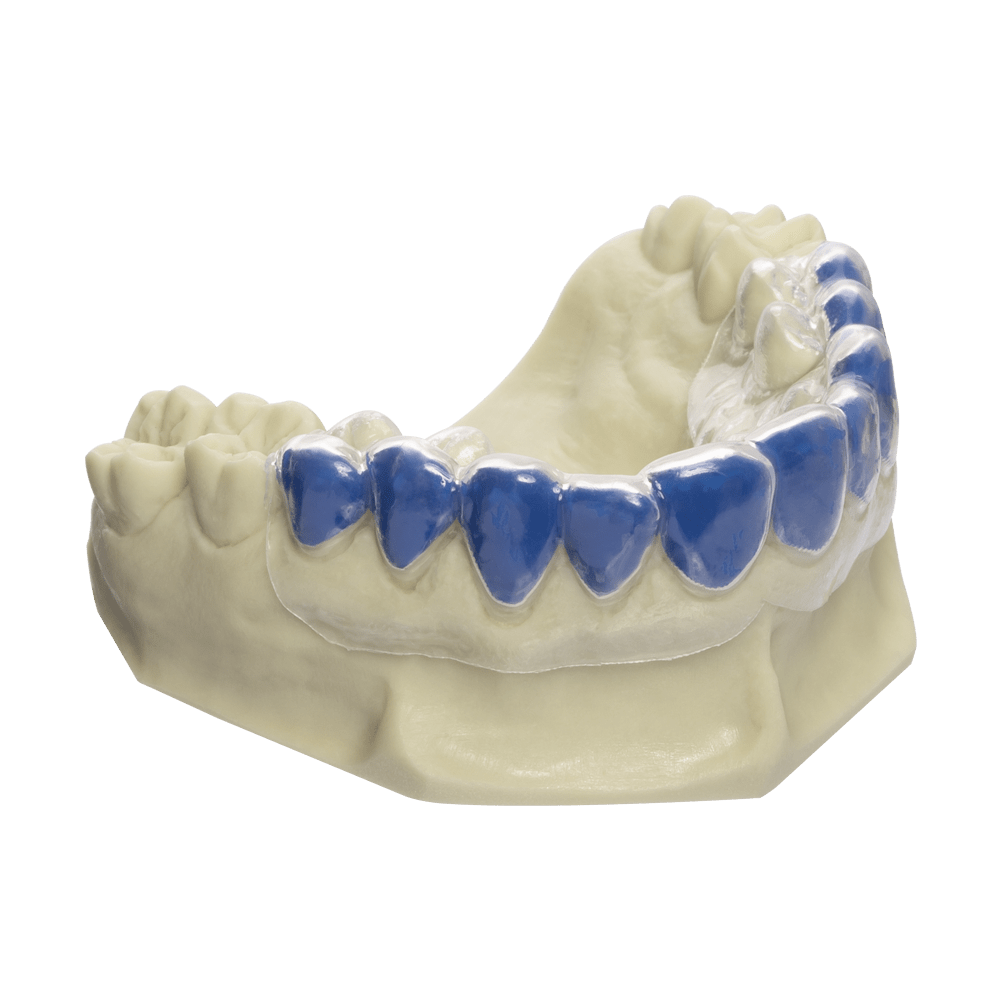 Transparent thermoforming blank made of vinyl acetate copolymer with a hardness of 95 Shore A. For the production of soft, bleaching splints extending the gingival margin.