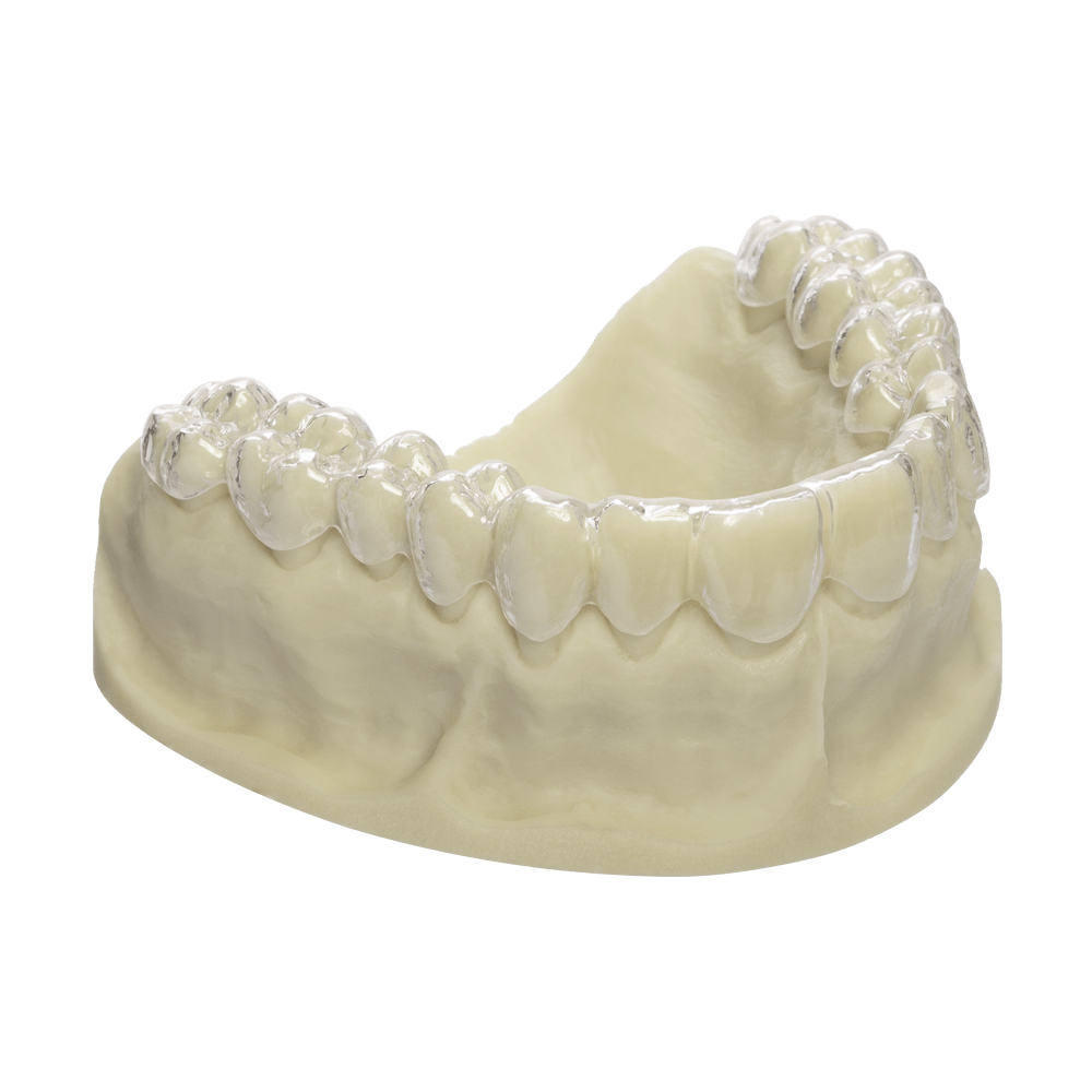 The thermoforming blank made of PETG (polyethylene terephthalate glycol) is supplied with an insulating film for the purpose of high transparency. Since it is tough-elastic and can be built up with acrylate, it is particularly suitable for Aligner, bite and occlusion splints, as well as for orthodontic appliances.